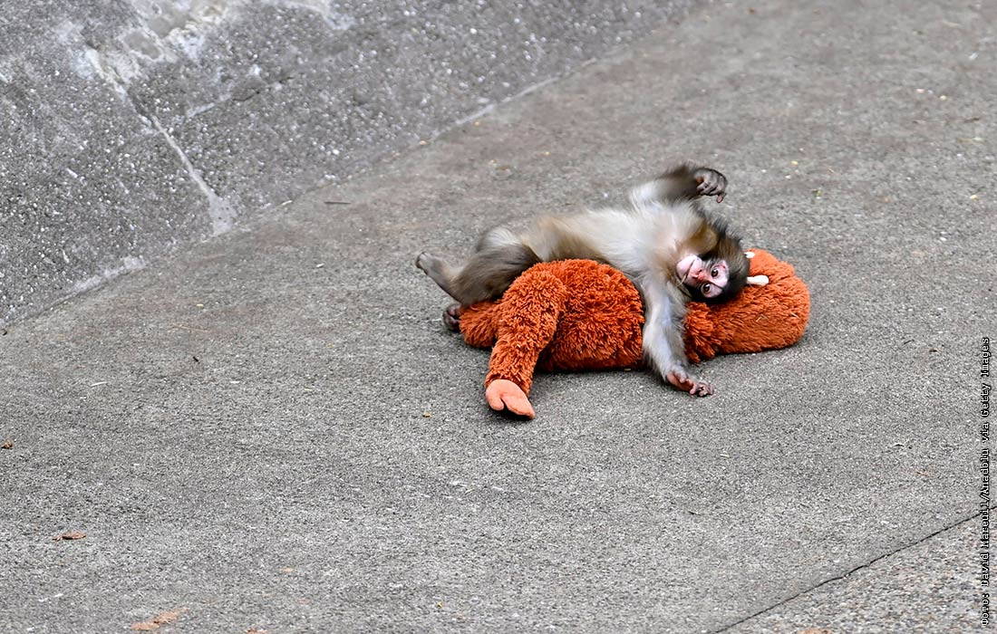 Детеныш обезьяны по кличке Панч с игрушкой в японском зоопарке