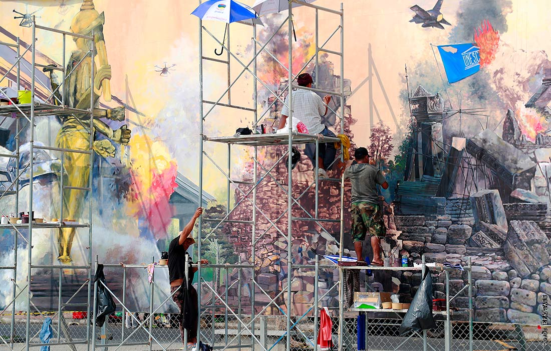 Более 70 камбоджийских художников объединись для создания масштабной фрески с целью призыва к немедленному прекращению вооруженного конфликта на границе Камбоджи и Таиланда
