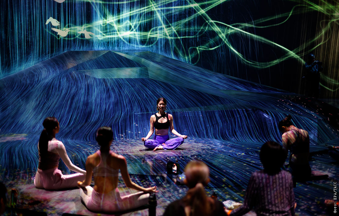 Занятие йогой в иммерсивном арт-пространстве teamLab Borderless в Токио
