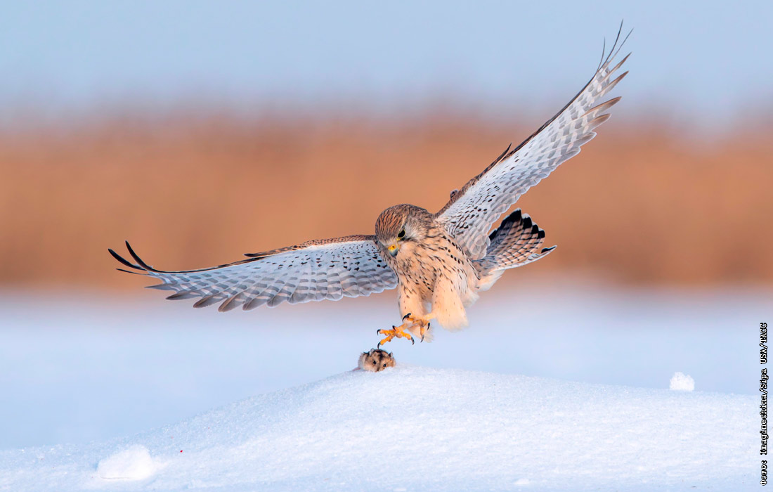 Пустельга во время охоты в водно-болотном парке Лунфэн в китайском Дацине