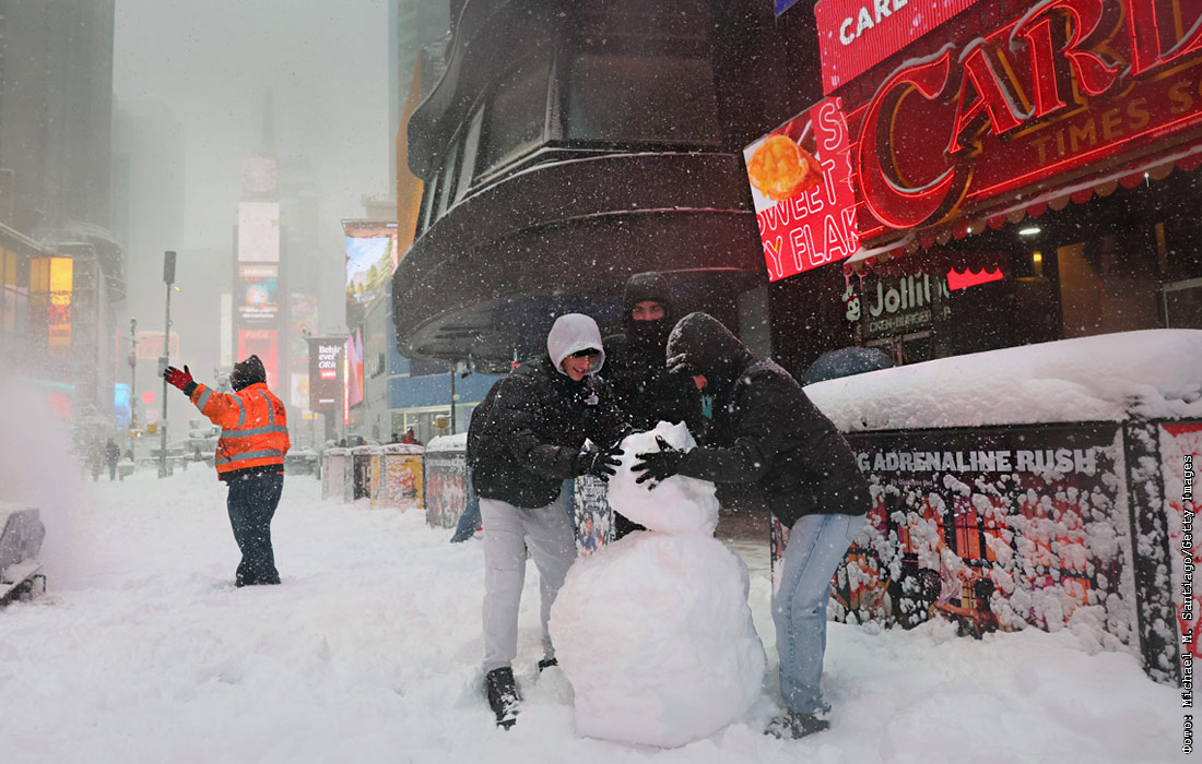 Жители Нью-Йорка лепят снеговика на Таймс-Сквер во время метели