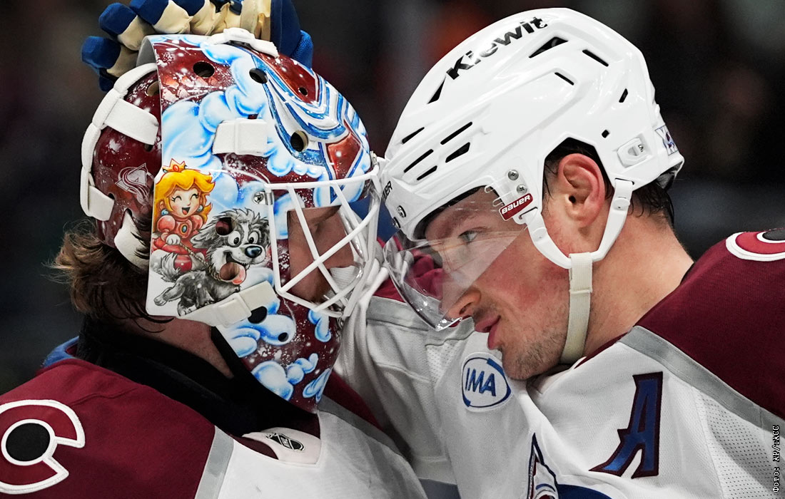 Защитник "Колорадо Эвеланш" Кейл Макар (справа) с вратарем Скоттом Уэджвудом празднуют победу над "Анахайм Дакс" в матче НХЛ в Калифорнии