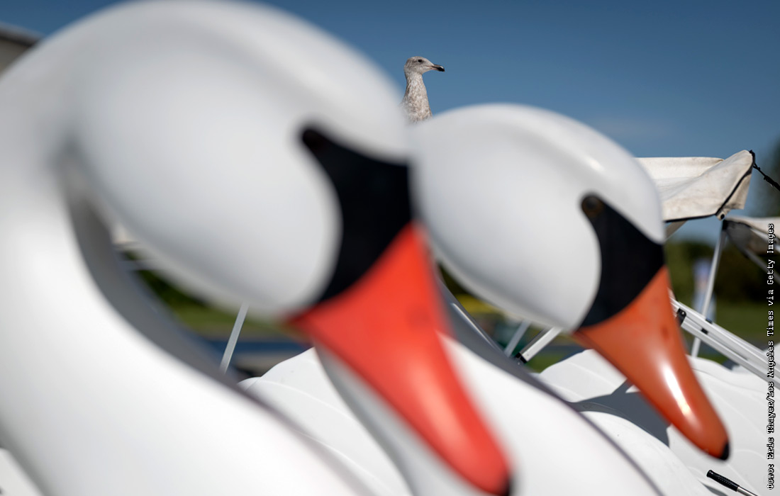 Чайка у пункта проката лодок-лебедей на озере Бальбоа в Лос-Анджелесе