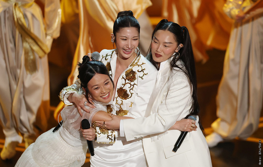 Певицы Рей Ами, EJAE и Одри Нуна во время исполнения песни Golden из мультфильма "Кей-поп-охотницы на демонов"