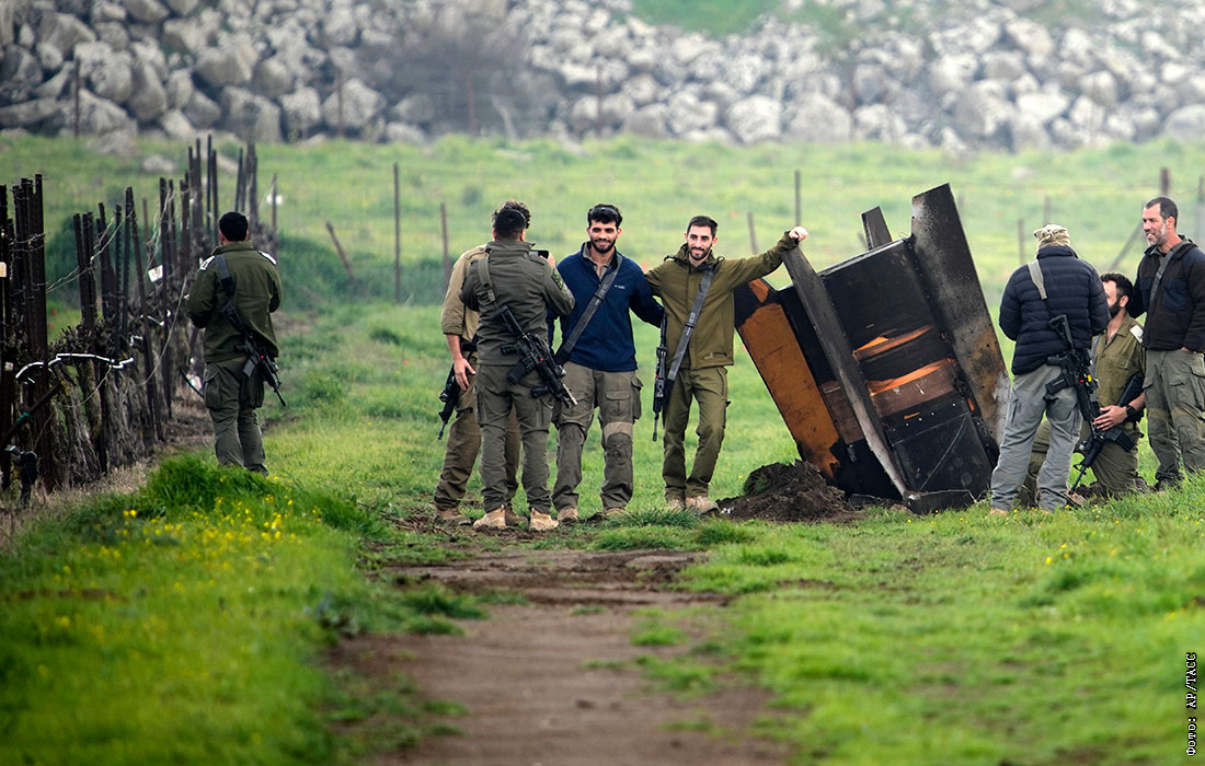 Израильские солдаты фотографируются рядом с фрагментом ракеты, выпущенной с территории Ирана