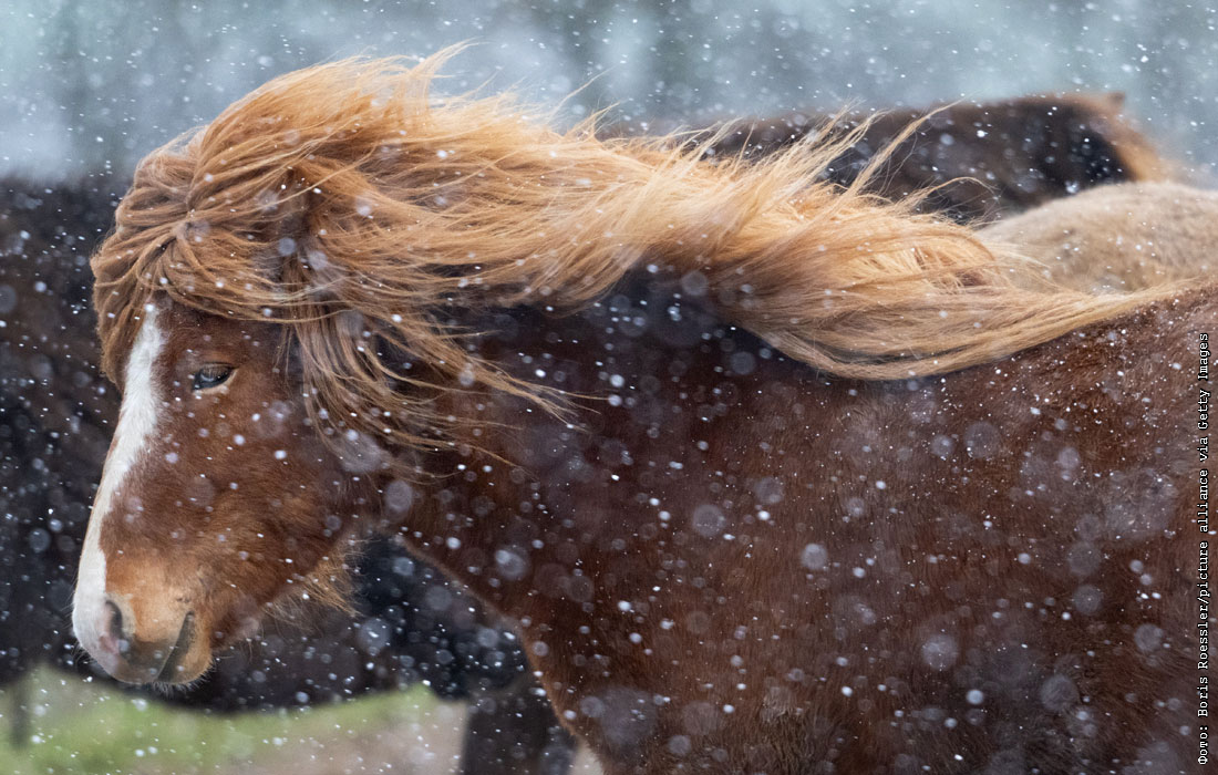 Исландская лошадь во время снегопада на пастбище в Таунусе, Германия