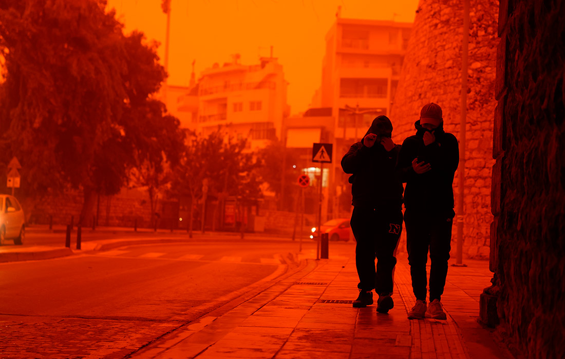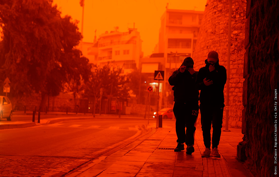 Песчаная буря накрыла греческий остров Крит. Из-за песка, принесенного из пустыни Сахары, небо приобрело оранжево-красный цвет.