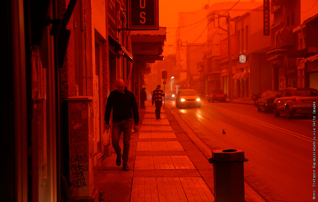 Песчаная буря накрыла греческий остров Крит. Из-за песка, принесенного из пустыни Сахары, небо приобрело оранжево-красный цвет.