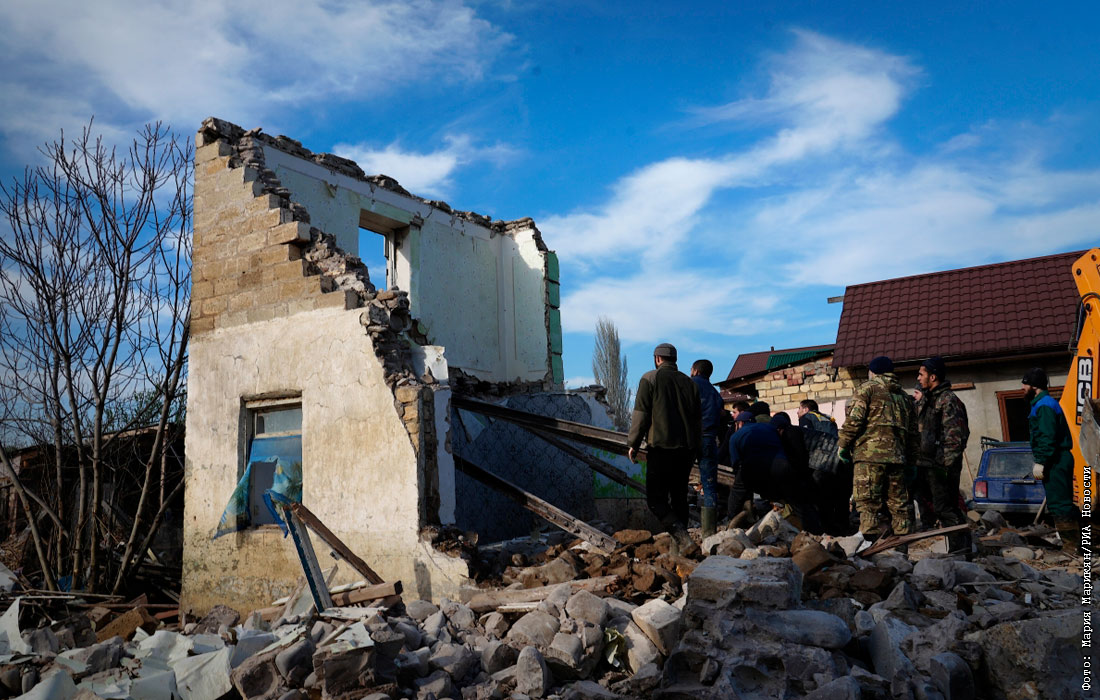 Добровольцы сносят остатки стен дома, разрушенного наводнением, в поселке Мамедкала в Дербентском районе