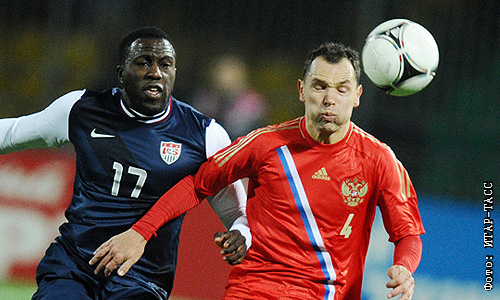 Игроки сборной США Жози Алтидор и сборной России Сергей Игнашевич (слева направо) во время товарищеского матча по футболу: Россия – США.
