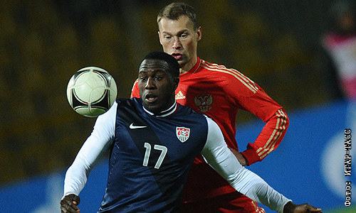 Игроки сборной США Жози Алтидор (на первом плане) и сборной России Василий Березуцкий (на втором плане) в товарищеском матче по футболу: Россия – США.