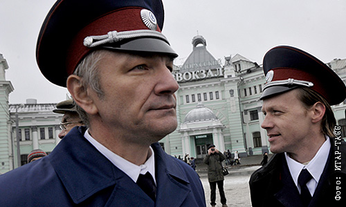 Во время патрулирования площади Белорусского вокзала участниками казачьей народной дружины.