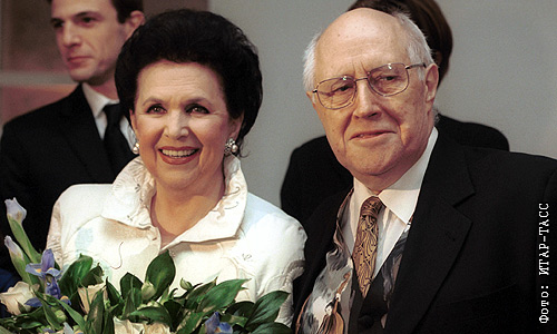 Юбилей Галины Вишневской отмечали почитатели таланта замечательной русской певицы. Родные, друзья и коллеги Галины Павловны собрались в созданной ею в Москве Высшей школе оперного искусства на Остоженке. Здесь состоялось чествование артистки, воплотившей на отечественной и зарубежной сцене неповторимые партии в операх классиков и современных авторов. На снимке: Галина Вишневская и ее супруг выдающийся музыкант и общественный деятель Мстислав Ростропович. 2001г.