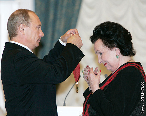 Президент России Владимир Путин вручил оперной певице Галине Вишневской орден "За заслуги перед Отечеством" второй степени на торжественной церемонии в Кремле. 2002г.