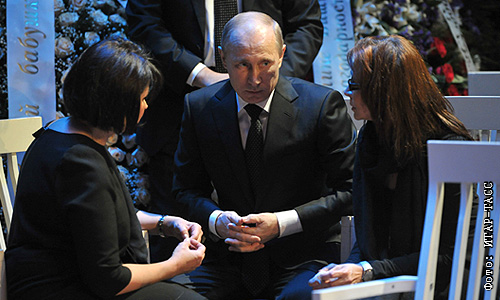 Президент РФ Владимир Путин и дочери Мстислава Ростроповича и Галины Вишневской Ольга и Елена (слева направо) во время церемонии прощания с оперной певицей Галиной Вишневской в Центре оперного пения Вишневской.