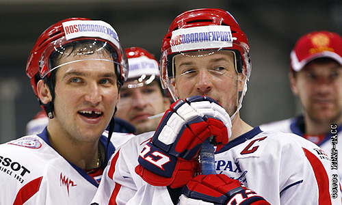 Игроки сборной России Александр Овечкин и Илья Никулин (слева направо на первом плане) после победы команды в финале Кубка Первого канала по хоккею 2012: Россия – Финляндия - 3:1.