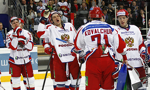 Игроки сборной России после победы в финале Кубка Первого канала по хоккею 2012: Россия – Финляндия - 3:1.