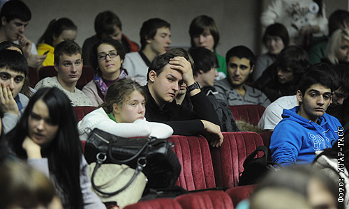 Студенты Российского государственного торгово-экономического университета (РГТЭУ), объявившие забастовку в связи с решением министерства образования РФ о признании университета неэффективным, в аудитории вуза.