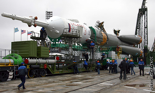Подготовка к запуску космического корабля "Союз ТМА-21" "Гагарин" со стартового комплекса космодрома Байконур.