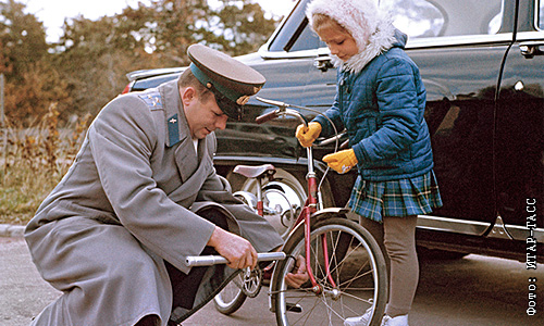 Первый космонавт Юрий Гагарин с дочкой Леной на прогулке.