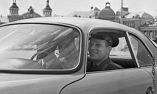 Летчик-космонавт СССР Юрий Гагарин за рулем спортивного автомобиля "Митра".