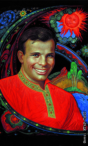 Палехская лаковая миниатюра "Юрий Гагарин" работы Бориса Кукулиева.