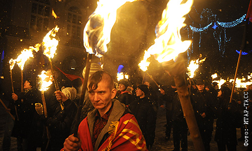 Участники шествия в День памяти героев Крут на одной из улиц города. 29 января – День памяти украинских студентов, погибших в неравном бою против отрядов РККА на железнодорожной станции около села Круты в январе 1918 года.