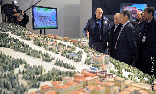 Президент Оргкомитета "Сочи-2014" Дмитрий Чернышенко, президент России Владимир Путин, вице-премьер РФ Дмитрий Козак, первый вице-спикер Госдумы Александр Жуков (слева направо на первом плане) и министр спорта РФ Виталий Мутко (справа на втором плане) во время осмотра макета горного Медиа центра в Красной поляне.