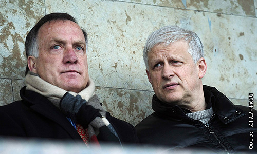 Главный тренер сборной России по футболу Дик Адвокат и президент РФС Сергей Фурсенко (слева направо) на матче чемпионата России по футболу: "Зенит" (Санкт-Петербург) - ЦСКА (Москва) - 1:1.