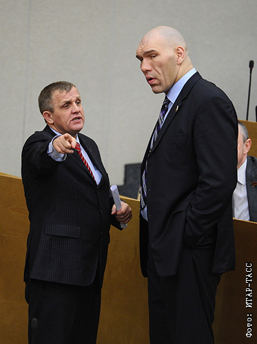 Член комитета ГД по труду и социальной политике Николай Коломейцев и член комитета ГД по физической культуре, спорту и делам молодежи Николай Валуев (слева направо) на пленарном заседании Госдумы РФ.