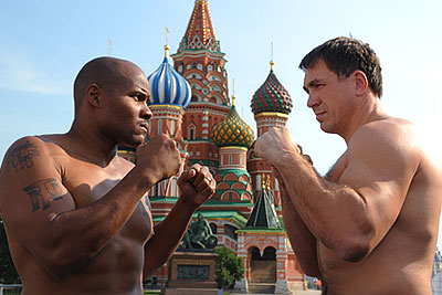 Боксеры Роберт Хоукинс и Олег Маскаев после взвешивания для шоу "Звезды ринга на Красной площади"