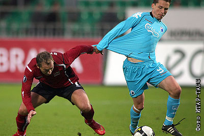 Игроки "Москвы" Петр Быстров и "Копенгагена" Мортен Нордстранд (слева направо) в матче Кубка УЕФА по футболу: "Москва" (Россия) - "Копенгаген" (Дания) - 1:2.