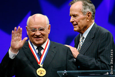 В Филадельфии Джордж Буш-старший торжественно вручил Медаль свободы (Liberty medal) экс-президенту СССР Михаилу Горбачеву за вклад в окончание "холодной войны"