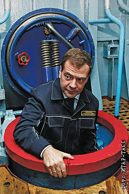 Президент России Дмитрий Медведев во время посещения атомного подводного крейсера стратегического назначения "Святой Георгий Победоносец" на базе подводных лодок Тихоокеанского флота в бухте Крашенинникова
