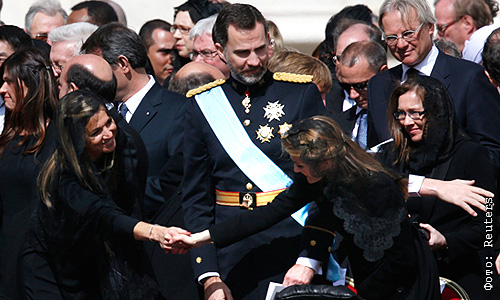 Принцесса Нидерандов Максима здоровается с принцессой Летицией, супругой принца Астурийского Фелипе, который стоит между ними.