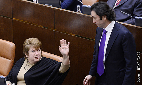 Члены комитета СФ по науке, образованию, культуре и информационной политике Любовь Глебова и Максим Кавджарадзе на заседании Совета Федерации.