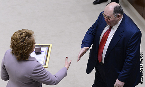 Спикер СФ РФ Валентина Матвиенко и сенатор от Пензенской области Борис Шпигель на заседании Совета Федерации.