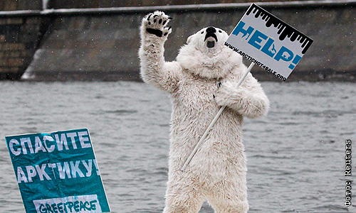 Эколог в костюме медведя на искуственной льдине смог доплыть до Кремля, где его подобрал катер МЧС. Участника акции забрали в УВД "Якиманка", откуда затем отпустили без предъявления обвинений.