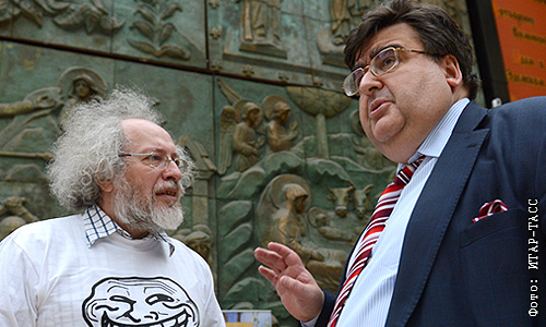 Главный редактор радиостанции "Эхо Москвы" Алексей Венедиктов и депутат фракции "Справедливая Россия" Алексей Митрофанов (слева направо) на праздновании 15-летия сайта радиостанции "Эхо Москвы" в Галерее искусств Зураба Церетели.