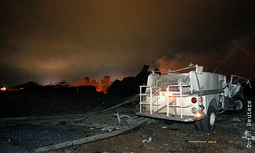 В результате сильнейшего взрыва пламя охватило несколько расположенных рядом с предприятием зданий. Погибших подсчитать пока невозможно, в спасательных службах заявляют, что их может быть как минимум 60.