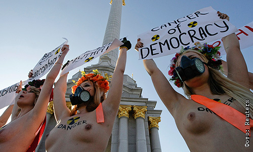 Во время открытия Международного форума, посвященного 25-летию Чернобыльской трагедии, женское движение FEMEN провело акцию "Бардак в Саркофаг".