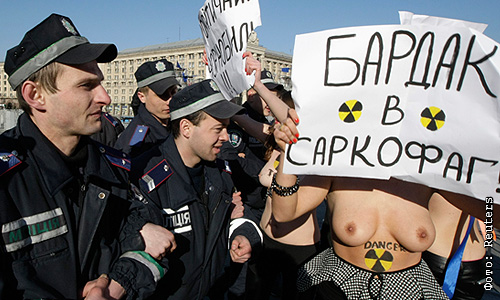 Во время открытия Международного форума, посвященного 25-летию Чернобыльской трагедии, женское движение FEMEN провело акцию "Бардак в Саркофаг".
