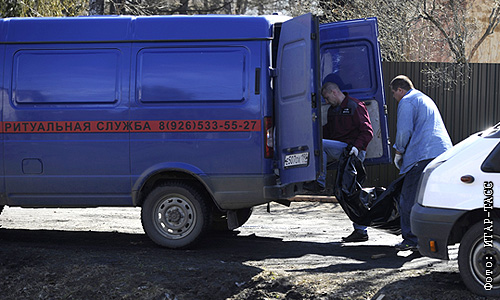 Сотрудники ритуальной службы на месте пожара в здании психиатрической больницы №14 в поселке Раменский.
