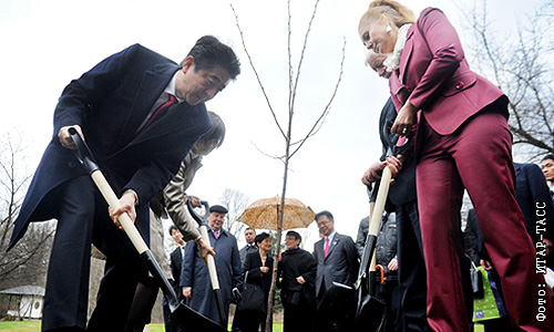 Премьер-министр Японии Синдзо Абэ во время посадки сакуры в Японском саду Главного ботанического сада им. Н.В. Цицина.