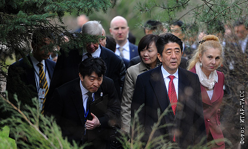 Премьер-министр Японии Синдзо Абэ (на первом плане) во время посещения Японского сада Главного ботанического сада им. Н.В. Цицина.
