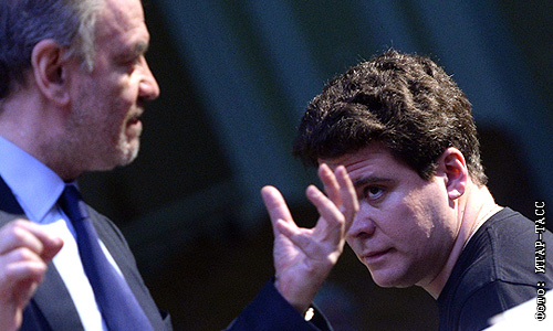 Художественный руководитель Московского Пасхального фестиваля, дирижер Валерий Гергиев и пианист Денис Мацуев (слева направо) во время репетиции перед началом выступления на открытии XII Московского Пасхального фестиваля в Большом зале консерватории.