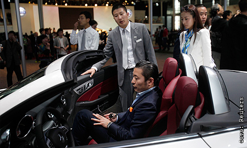 Посетитель Международного автосалона в Шанхае изучает Mercedez Benz SLK 350