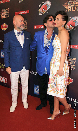 Совладелец "Русской медиа-группы" Сергей Кожевников (слева) с супругой Екатериной и певец Григорий Лепс (справа) на церемонии вручения русской музыкальной премии телеканала RU.TV 2013.
