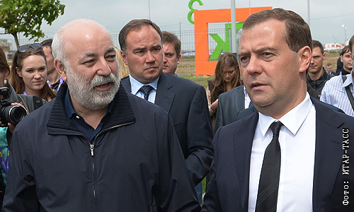 Президент фонда "Сколково" Виктор Вексельберг и премьер-министр РФ Дмитрий Медведев перед международной конференцией для стартапов и инвесторов "Startup Village" у здания Гиперкуба Инновационного центра "Сколково".