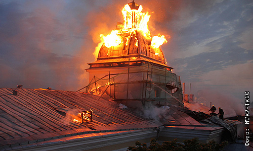 Сообщение о пожаре поступило дежурному в среду в 21:30. Через несколько минут на место прибыли первые пожарные расчеты. В 21:54 пожару был присвоен второй номер сложности, который в дальнейшем был изменен на третий. Горели чердак и кровля.